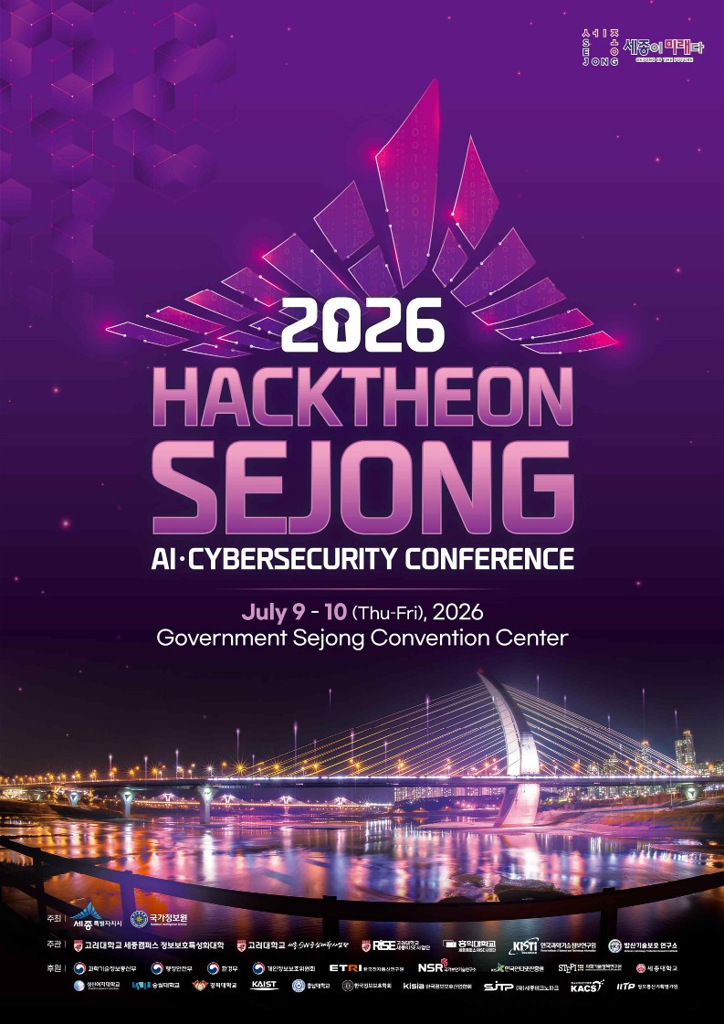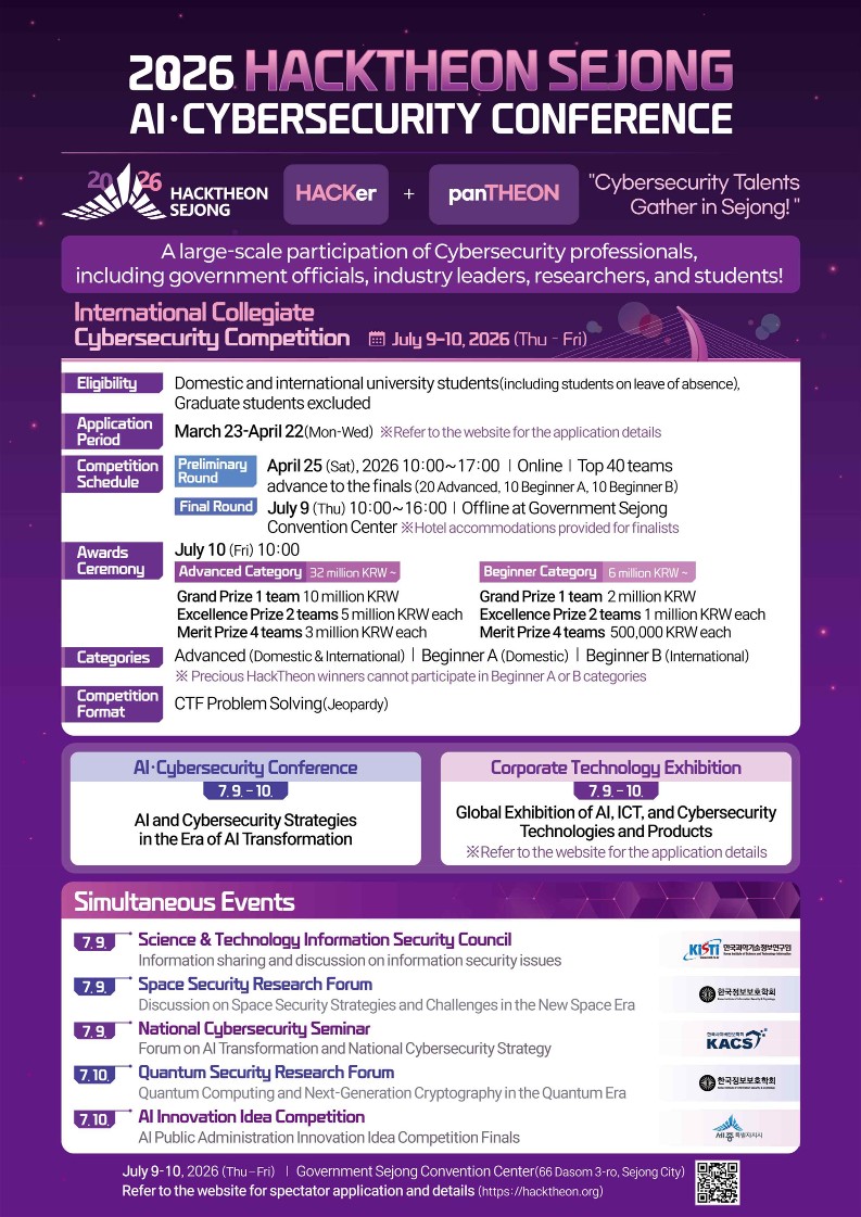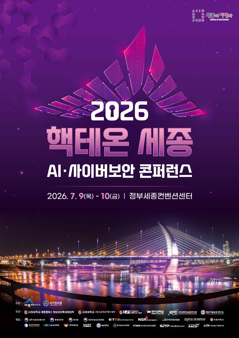 세종특별자치시에서 「2026 핵테온 세종(HackTheon Sejong)」 국제 대학생 사이버보안 경진대회를 개최합니다. 관심있는 학생들의 참여 바랍니다.