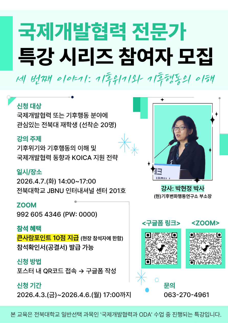 🔹신청 대상: 국제개발협력 또는 기후행동 분야에 관심있는 전북대 재학생 (선착순 20명)