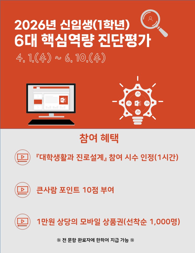 2026학년도 신입생(1학년) 6대 핵심역량 진단평가를 아래와 같이 실시하오니, 신입생(1학년) 여러분들의 많은 참여바랍니다.