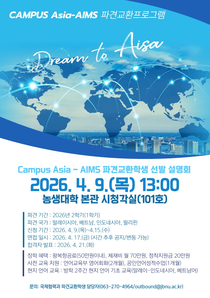 2026학년도 2학기 CAMPUS Asia-AIMS사업 해외 파견 교환학생을 선발하고자 하오니 학생들의 많은 관심 바랍니다.