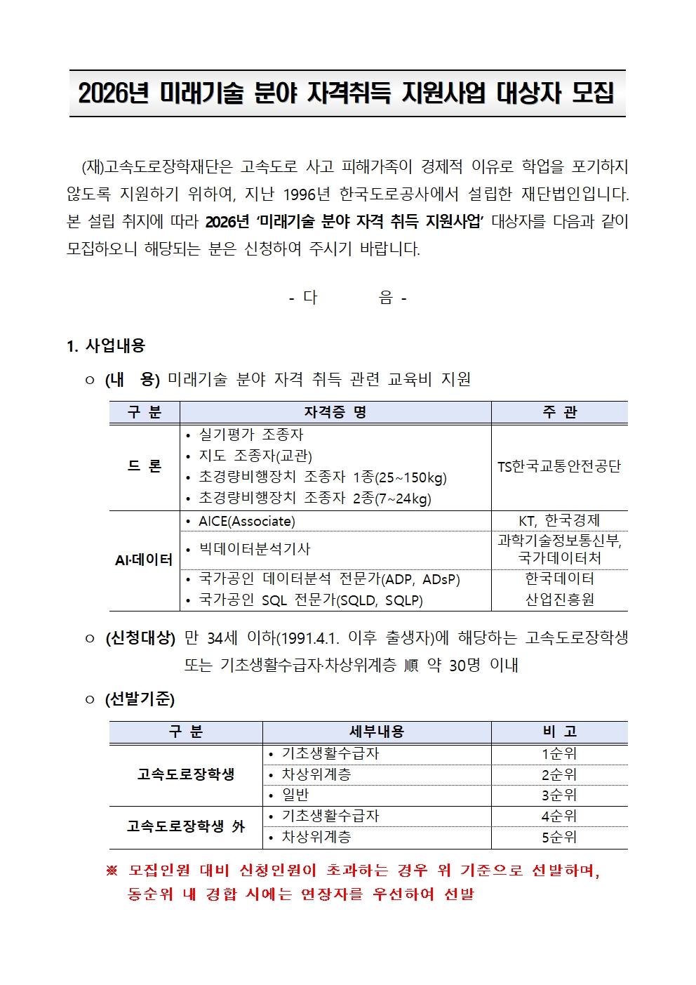 (고속도로장학재단) 2026년 고속도로장학재단 미래기술 분야 자격취득 지원대상자 모집 안내