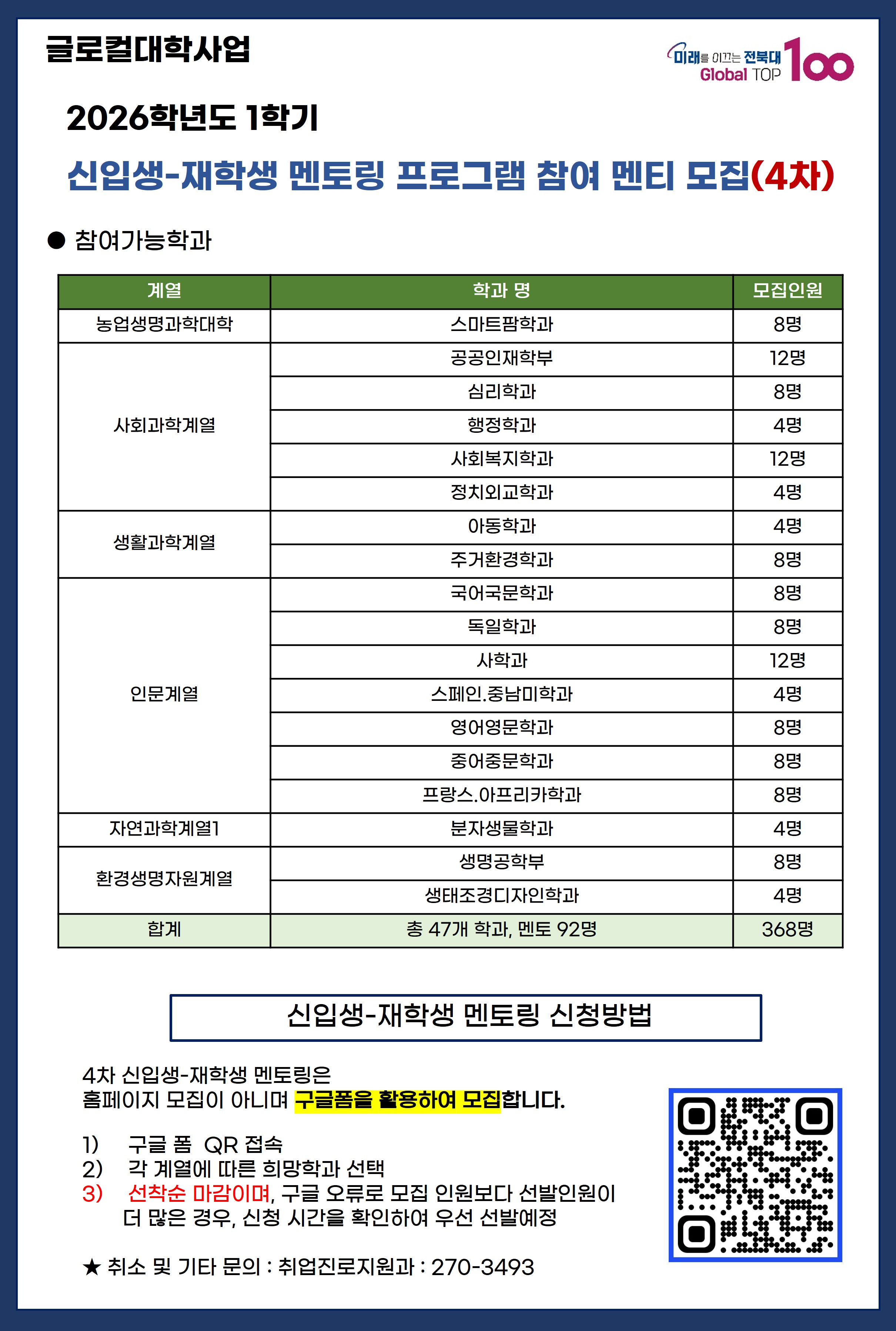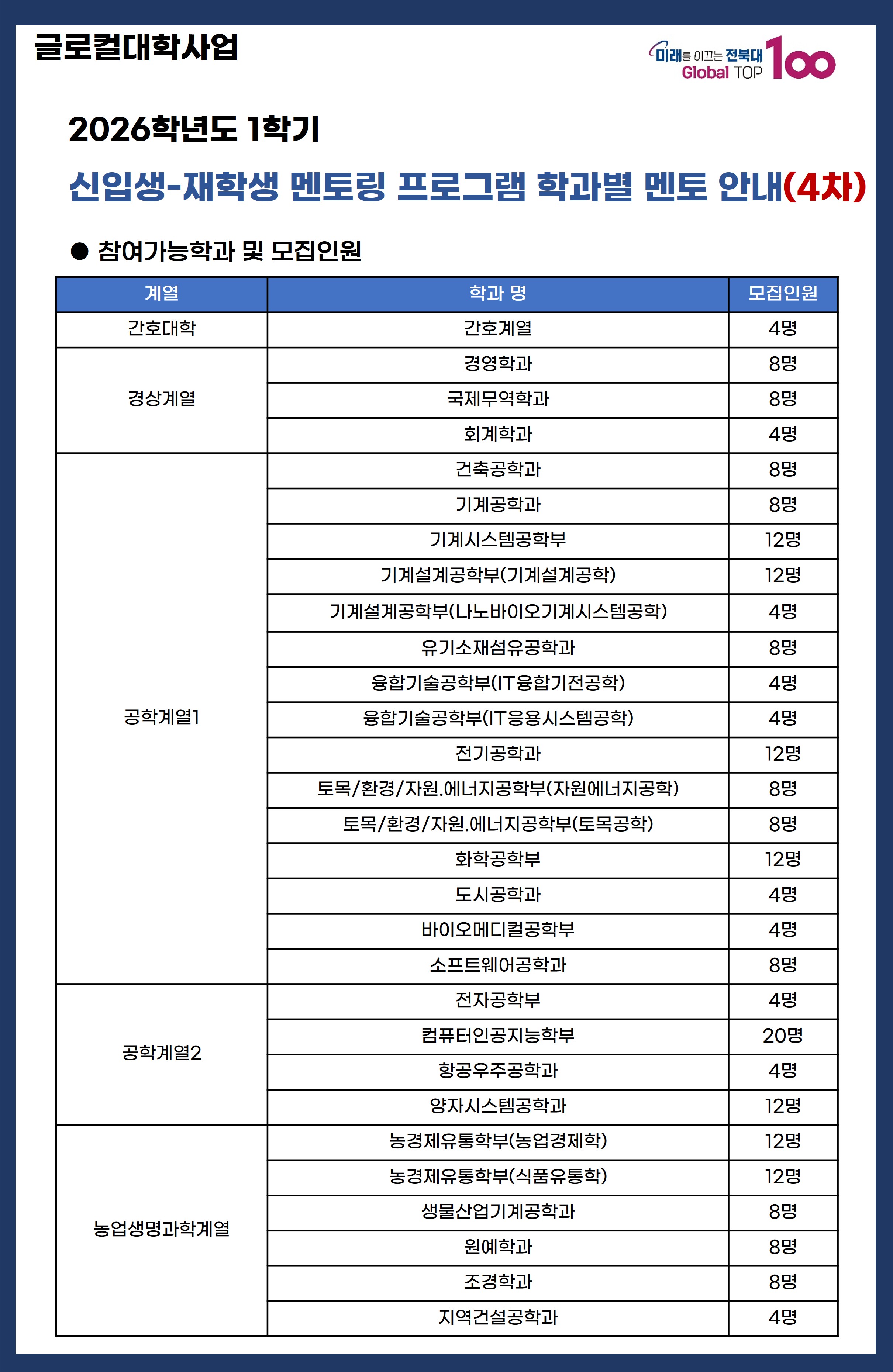 2026학년도 신입생-재학생 멘토링 참여 멘티 모집(4차)