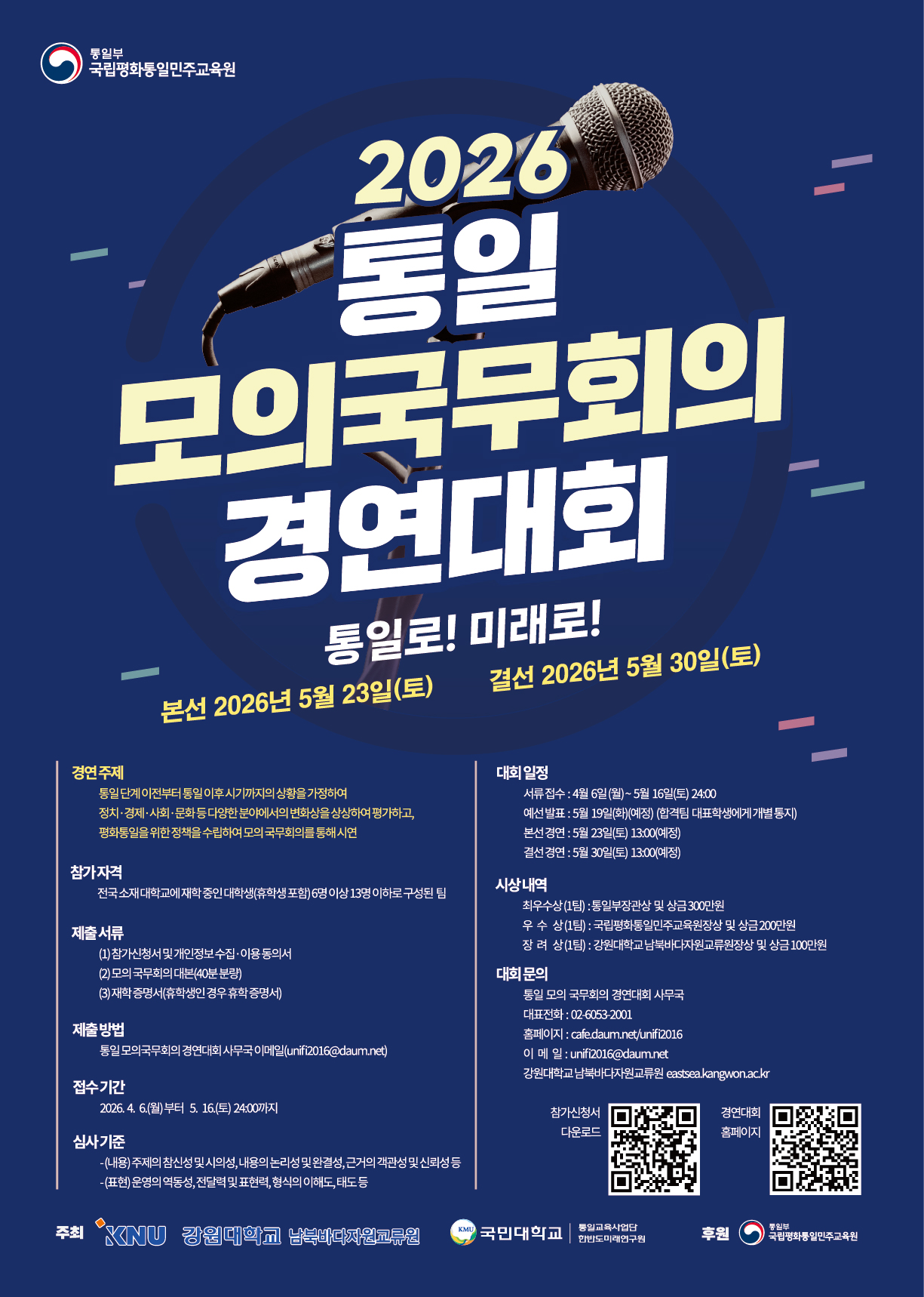 강원대학교에서 2026년 통일 모의 국무회의 경연대회를 개최합니다. 관심있는 학생들의 참여 바랍니다.