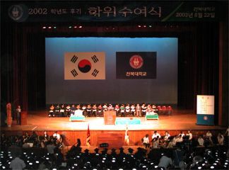 우리 대학 2002학년도 후기 학위 수여식이 두재균 총장, 차종선 동창회장, 처.실.국장, 학(원)장, 졸업생과 학부모 등이 참석한 가운데 제52회 졸업식이 8월 22일(금) 오전 11시 전북대학교 삼성문화회관에서 개최되었다.