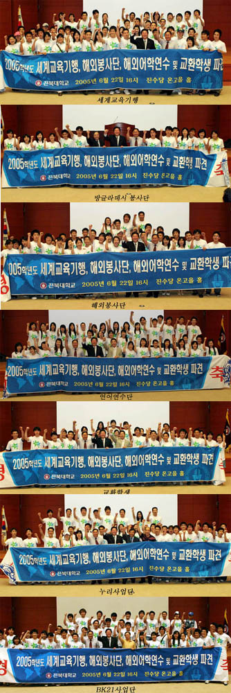 우리 대학은 글로벌 인재양성 프로그램을 적극 추진하기 위해서, 2005학년도 여름방학 해외연수단 발대식을 22일 오후 4시 30분 교내 진수당 온고을홀에서 두재균 총장과 본부 보직교수 및 연수단 학생 들이 참석한 가운데 개최하였다.