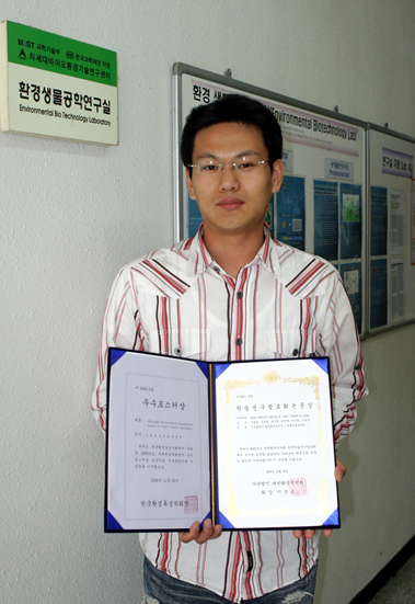 조철웅 군은 지난 11월 3일 열린 2005년도 대한환경공학회 춘계학술연구발표회에서 “Acute toxicity testing of ionic liquids on algae"를 제목으로 학술연구발표회 논문상을 수상하였다. 또한 11월 25일 열린 한국환경독성학회 2005년도 추계학술대회에서 ”Microalgal Photosynthesis Measurement System for Rapid Toxicity Assessment"를 제목으로 우수포스터상을 수상하였다.