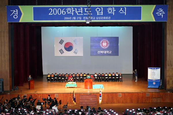 2006학년도 입학식이 2월 27일(월) 오후 2시 전북대학교 삼성문화회관에서 두재균 총장과 처·실·국장·대학(원)장 및 대학 관계자들과 신입생, 학부모 1,000명이 참석한 가운데 거행되었다.