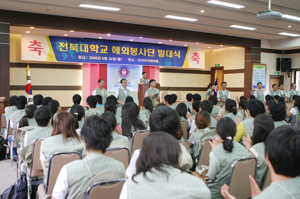 저개발 국가에서의 봉사활동을 통해 풍부한 국제경험과 자기개발을 위한 기회를 제공하고, 우리 민족의 전통과 미풍양속을 세계인에게 알리기 위해 파견하는 2006학년도 하계 전북대학교해외봉사단 발대식이 6월 26일(월) 오전 10시 30분부터 대학 본부 별관 3층 건지아카데미홀에서 최낙원 학생처장 및 봉사단 단장, 학생 160여명이 참가한 가운데 열렸다.