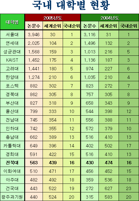 특히 우리 대학은 2005년에 563편의 SCI 논문을 발표하여 2004년 430편에 비해 논문수 증가율이 30.9%로 우리나라 논문수 증가율(27.1%)보다 높게 나타났다.