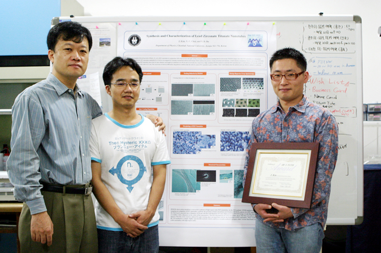 자연과학대학 물리학과 부상돈 교수와 대학원생 김종옥, 최용찬 학생이 지난 9월 3일부터 7일까지 동경이과대학에서 열린 '제5회 아시아 강유전체 학회(Asian Meeting on Ferroelectrics, AMF)'에서 최고의 포스터 발표상인 "Poster Award"을 획득하였다.