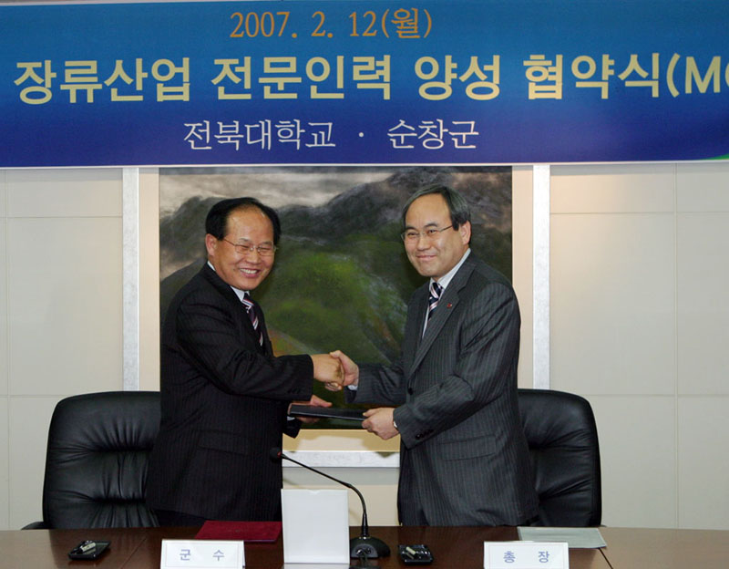 우리 대학(총장 서거석)과 순창군(군수 강인형)이 우리나라 장류산업 발전과 전문인력 양성 등을 목적으로 상호 공동사업 추진, 지식정보 교류와 정책개발 등을 도모하기 위해 2월 12일(월) 오전 11시 30분 대학 본부 8층 회의실에서 협약을 체결하였다.