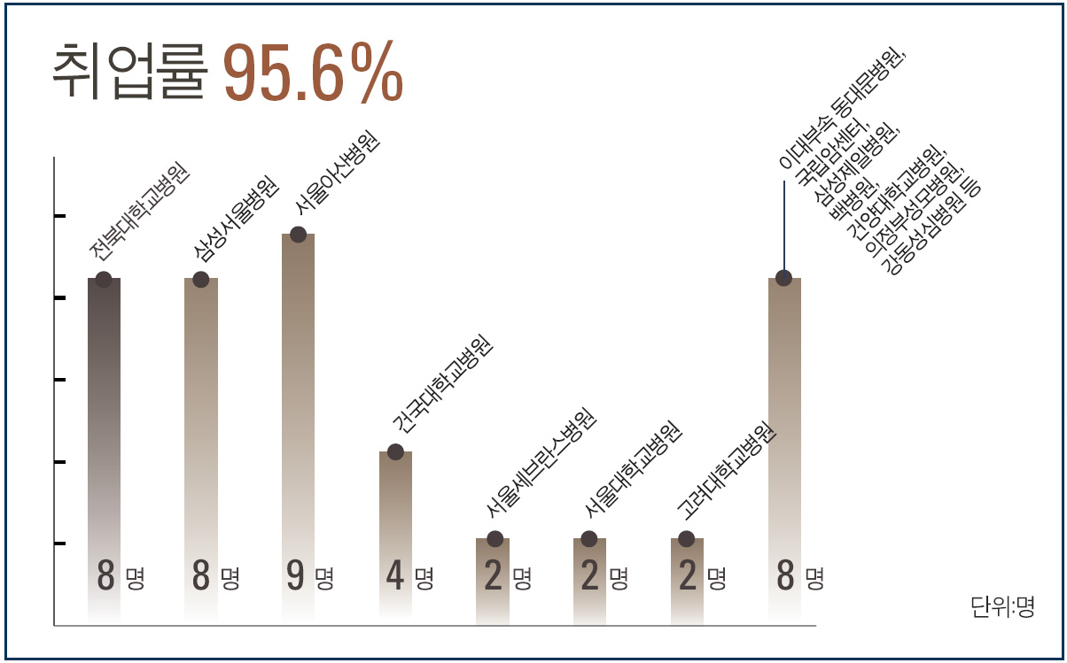 취업의 질적인 측면에서도 전북대학교병원 8명, 삼성서울병원 8명, 서울아산병원 9명, 건국대학교병원 4명, 서울세브란스병원 2명, 서울대학교병원 2명, 고려대학교병원에 2명을 비롯 이대부속 동대문병원, 국립암센터, 삼성제일병원, 백병원, 건양대학교병원, 의정부성모병원, 강동성심병원 등에 취업해 전국 최고 수준을 자랑했다.