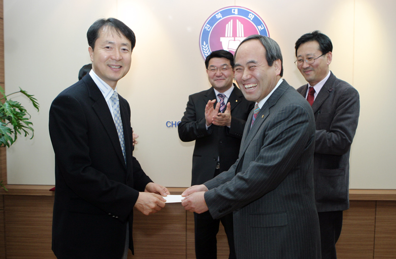 의학전문대학원 최하영 교수(의학, 83년 졸)가 4월 4일 대학 본부 4층 총장실에서 서거석 총장에게 발전기금 천만원을 기탁하였다. 최교수는 우리 대학에서 학·석·박사를 마치고 현재 의학전문대학원 신경외과학 교수로 재직중이다.