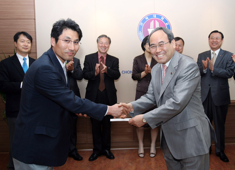 우리 대학 동문인 「21세기 병원」최철 원장(의학, 85학번)이 발전기금 일천만원을 5월 8일(화) 오전 서거석 총장에게 전달했다.