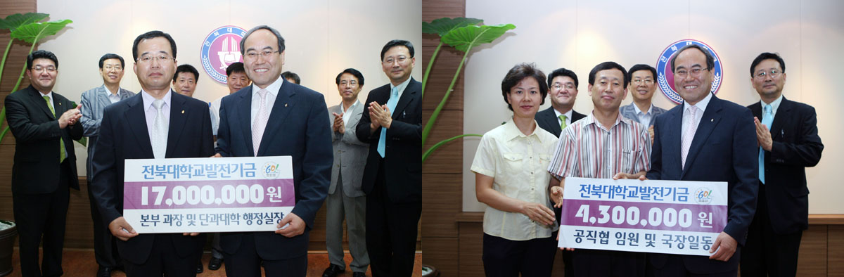 같은 날 대학 본부 과장단과 단과대학 행정실장 12명이 발전기금 1천7백만원을 전달했다. 이날 발전기금은 예술대 양병태 행정실장, 기획과 김삼전 과장, 학생과 오원태 과장, 장학취업과 박종연 과장, 시설과 진성하 사무관 등 5명이 각각 2백만원씩 1천만원을, 학사관리과 최승현 과장, 학술진흥과 하관호 과장, 산학협력과 임평수 과장, 연구지원과 박정진 과장, 농생대 김동환 행정실장, 사범대 이성우 행정실장, 도서관 여인술 과장이 각각 1백만원씩 7백만원을 기탁하였다.