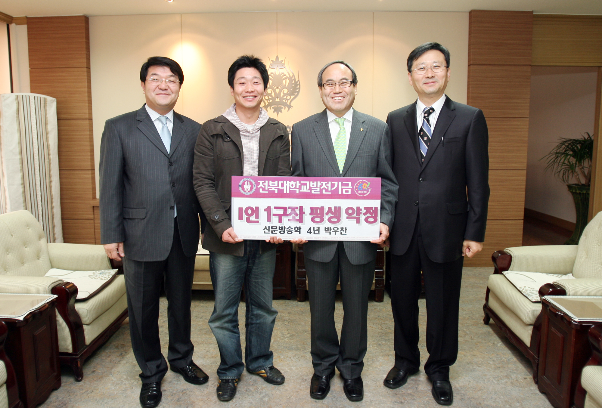 박씨는 또 “우리의 영원한 고향이 될 전북대학교의 발전을 위해 모두 함께 동참하자는 차원에서 소액이지만 발전기금을 기탁하게 됐다”며 “우리 모두가 작은 정성을 모으면 머지않아 우리 대학은 세계 100대 대학의 반열에 오를 수 있을 것”이라고 덧붙였다.