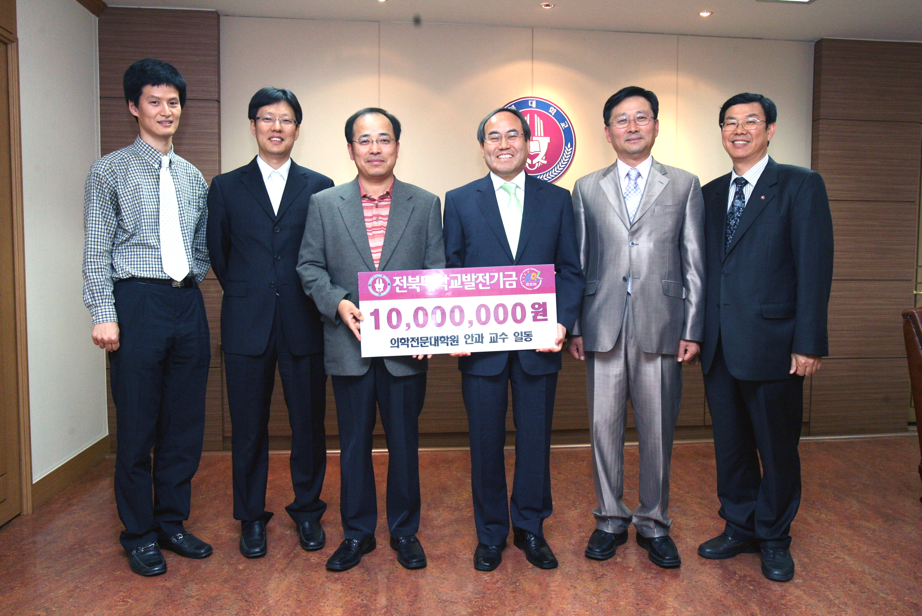우리 대학 의학전문대학원 안과 조남천, 유인천, 안민, 이동욱 교수는 14일 오후 3시 30분 서거석 총장에게 대학발전기금 1천 만원을 전달했다.