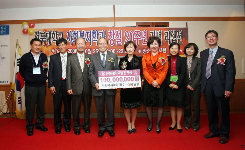 전주 한마음병원 최경수 원장(전북대 의대 72학번)이 지난 10월 25일 우리 대학 예지원에서 열린 사회복지학과 창설 20주년 기념 리셉션에서 대학발전기금 1억원을 쾌척했다.