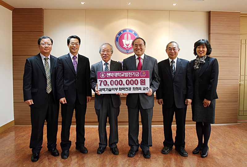 최 교수는 11월 10일 오전 11시 30분 자연과학대 장광엽 학장과 김철주 부학장, 박상규 화학과장, 이영아 교수 등과 함께 서거석 총장을 접견하고, 학과 발전을 위해 써달라며 발전기금 7천만 원을 쾌척했다.