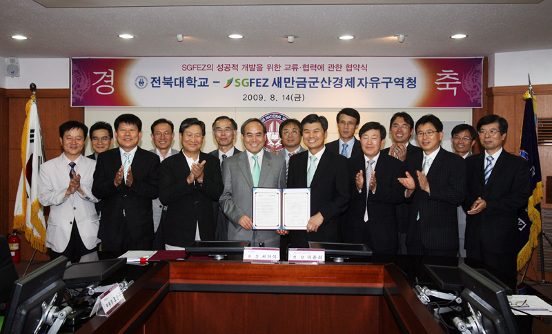 우리 대학과 새만금 군산경제자유구역청(청장 이춘희ㆍ이하 새만금경자청)이 새만금군산 경제자유구역의 성공적인 개발을 위해 8얼 14일 오후 2시 본부 8층 회의실에서 협약을 체결하고 긴밀한 협력관계를 유지해 나가기로 했다.
