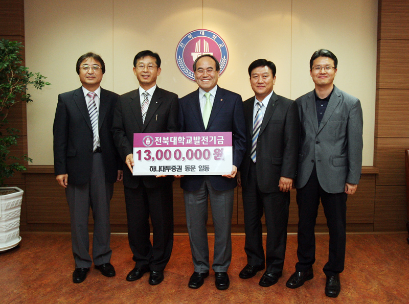 이날 기탁식에는 하나대투증권 전영배 서부지역본부장(무역학과 77학번)과 문근수 전주지점장(경영학과 80학번)이 참석해 이 운동에 동참할 것을 밝혔다.