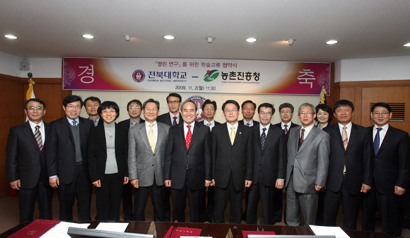 우리 대학이 11월 2일 오전 11시 30분 대학 본부 8층 회의실에서 농촌진흥청(청장 김재수)과 협약을 체결하고, 혁신도시 이전 및 녹색성장 기술개발을 위한 인ㆍ물적 교류를 약속했다.