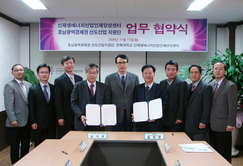 광역경제권 선도산업인재양성사업에 도내 유일하게 선정돼 지난 9월 문을 연 신재생에너지산업 인재양성센터와 ‘5+2 광역경제권 선도산업 육성사업’의 일환으로 호남권 선도산업 프로젝트를 총괄하는 호남광역경제권 선도산업지원단은 11월 17일 오후 5시 30분 협약식을 갖고 양 기관의 기술과 인력 교류를 약속했다.