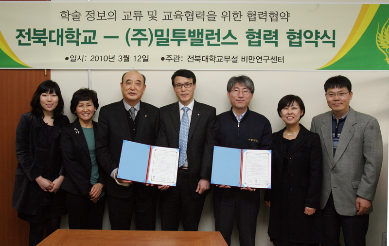 우리대학 비만연구센터(센터장 이양근)는 보리를 이용한 비만 예방 기능성 식품을 생산하고 있는 (주)밀투밸런스와 3월 12일 오후 2시 전북대 산학협력단장실에서 상호 협력을 위한 양해각서를 체결했다.