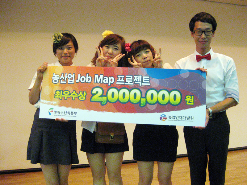 우리대학 농업경제학과 신동길(04학번)씨를 비롯해 김소연(07), 최미건(07), 동단비(09)씨 등 재학생으로 구성된 ‘Agri-Frontier'팀이 농림수산식품부가 주최하고 농업인재개발원 주관으로 열린 ’농산업 Job Map 프로젝트‘에서 최우수상을 수상하는 영예를 안았다.