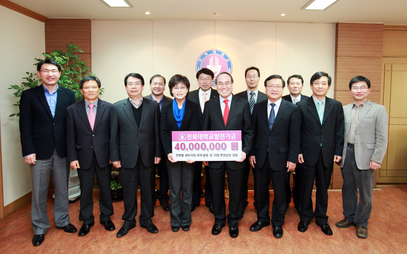 우리대학은 4월 5일 오후 2시 서거석 총장과 신효근 부총장을 비롯한 본부 보직자들과 서유미 사무국장과 본부 과장 및 단과대학 행정실장 등이 참석한 가운데 발전기금 기탁식을 가졌다.