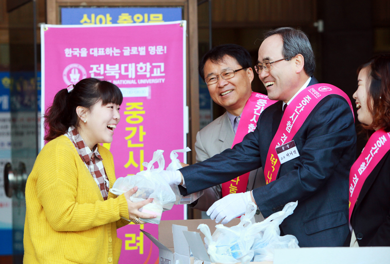 서거석 총장과 신효근 부총장을 비롯한 본부 보직자, 도서관장, 총학생회 학생 등이 10월 20일 오전 7시 학습도서관과 중앙도서관, 익산캠퍼스 현관에서 중간고사 기간 밤새 책과 씨름하는 학생 800여 명에게 떡과 우유를 나누며 격려하는 시간을 가졌다.
