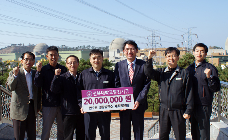 한국수력원자력 영광발전소에 재직하고 있는 우리대학 재직동문회(회장 김진태, 전기공학 77학번)가 모교에 발전기금 2천만 원을 기탁했다.