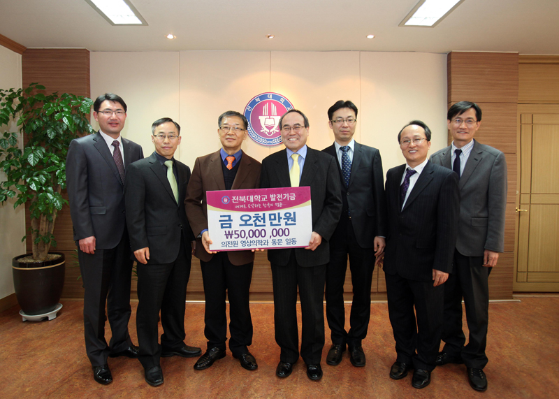 이날 발전기금을 기탁한 의전원 영상의학과 동문은 문무창 현대영상의학과의원 원장을 비롯해 양승문 익산중앙영상의학과의원 원장, 오종현 우주영상의학과의원 원장, 조호제 서울 안산방사선과의원장, 황승배 우리대학 의전원 영상의학과 교수 등 5명.