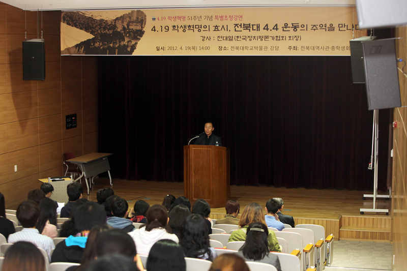 ‘전국 최초의 학생데모, 전북대 4.4시위의 주역을 만나다’라는 특별강연이 19일 오후 2시 우리대학 박물관 강당에서 열린 것. 당시 시위를 주도했던 정치학과 3학년 전대열(71·한국정치평론가협회장) 동문이 강사로 나서 4.4시위 당시의 생생한 얘기와 의미를 전했다.