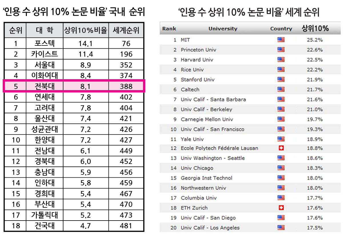 또한 우리대학은 거점 국립대 중에서도 5~6%대를 기록한 여타의 대학들을 멀찌감치 따돌리고 1위에 올라, 국·사립을 막론하고 세계 수준의 논문을 많이 쓰는 대학의 명성을 공고히 했다.