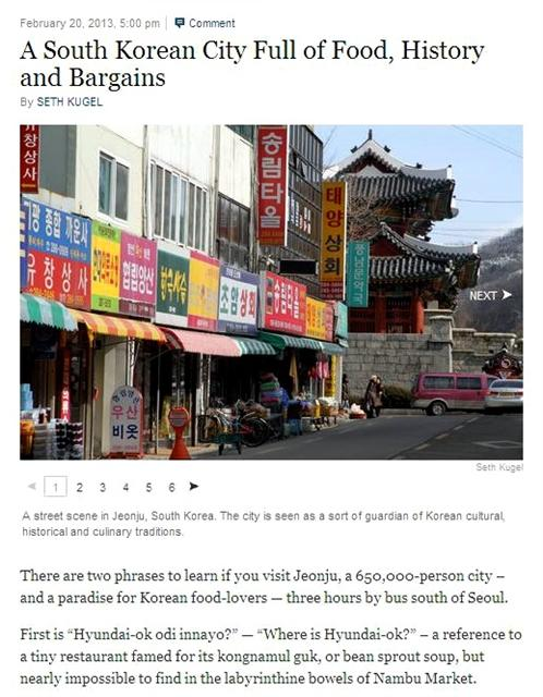 전주를 여행한 뒤 세스쿠겔 기자는 지난 2월 20일자 기사를 통해 “전주는 저렴한 가격에 숙취를 해결할 수 있는 콩나물국밥, 신선한 재료들로 가득 채워지는 전주비빔밥, 반찬이 끊임없이 리필되는 백반집 등 한식 식도락가들을 위한 천국”이라며 “친절한 서비스로 한옥 민박이 가능하고, 조선왕조의 본향으로 태조 이성계의 어진이 봉안된 경기전 등 명소가 가득하다”고 전주를 평가했다.