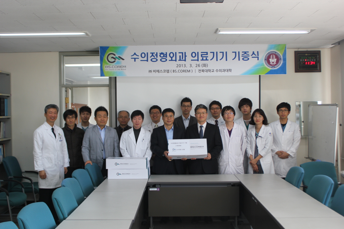 기증업체인 (주)비에스코렘은 정형외과 임플란트, 골수복재, 기구 등 동물전용 의료기기를 전문적으로 생산하는 수의 전문 제조업체로 지난 2011년 4월 창립 이래 전북대 수의대와 꾸준한 공동연구를 추진하여 지난해 9월 국내 최초로 ‘소동물정형외과세미나’를 공동으로 개최하는 등 교류를 이어왔다.