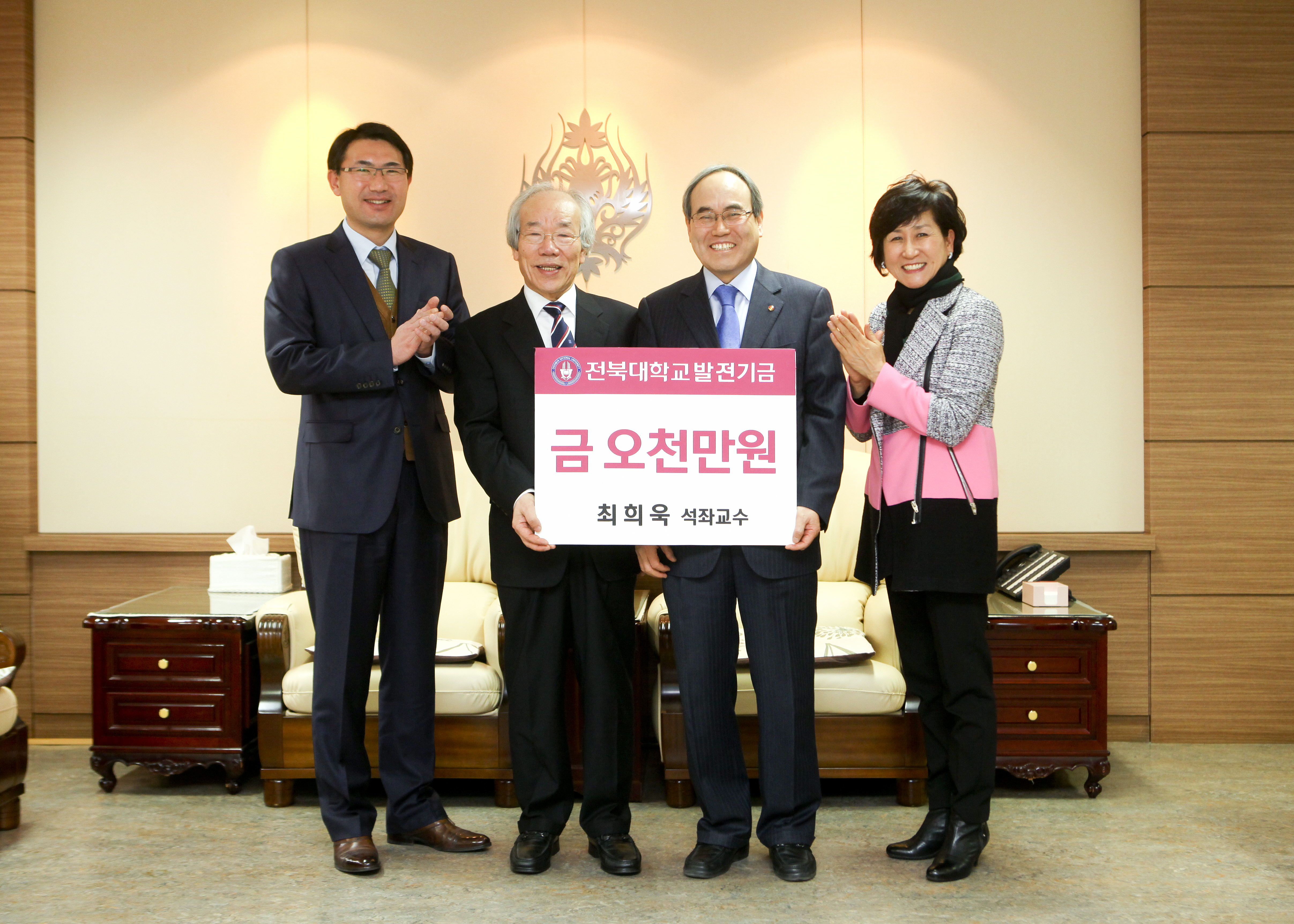최 교수는 3월 12일 오전 11시 서거석 총장을 접견한 자리에서 발전기금 기탁식을 갖고 이 기금을 통해 전북대 후배 연구자들이 좋은 환경에서 연구에 매진할 수 있도록 힘써달라고 당부했다.