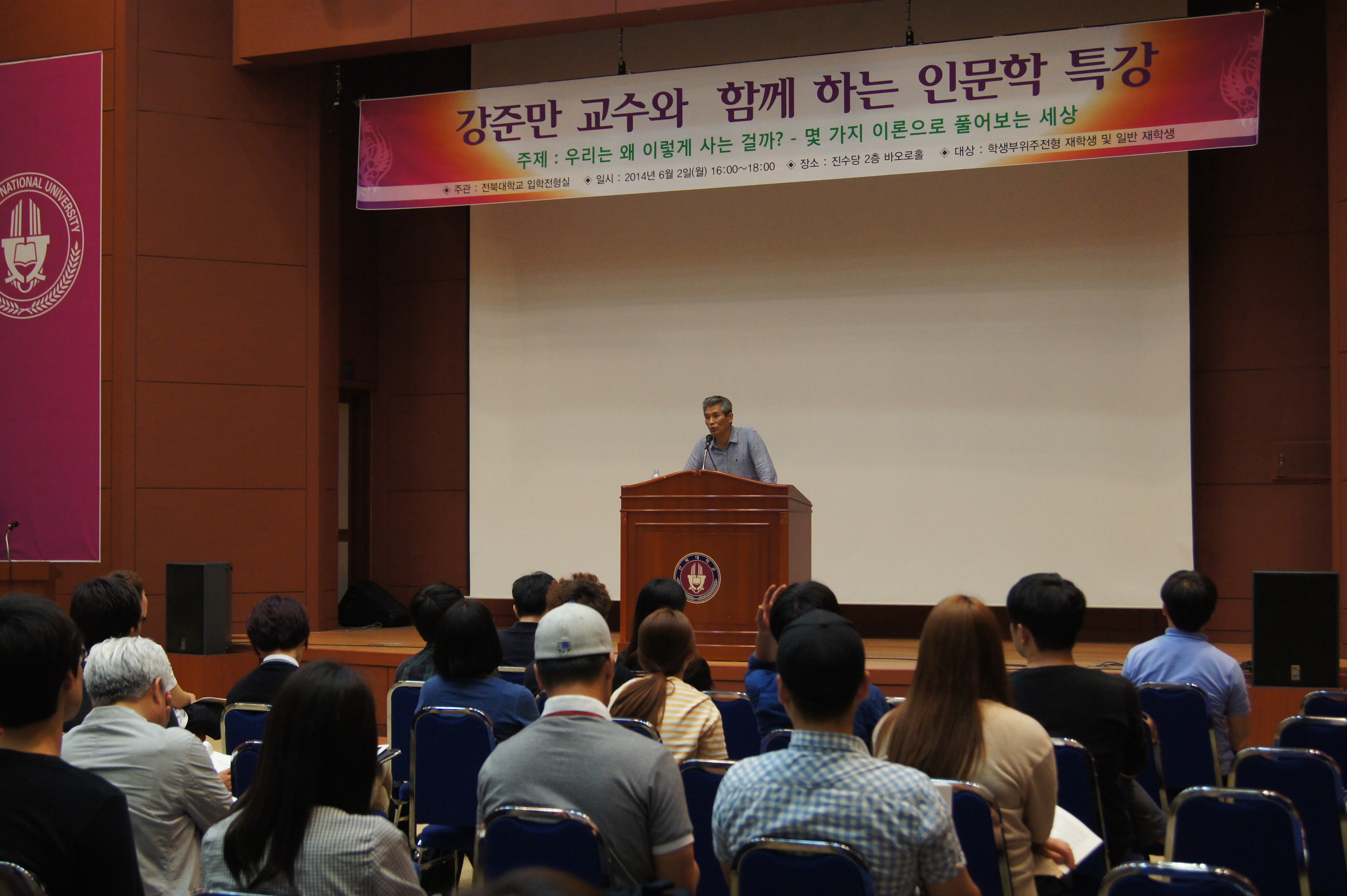 입학전형실이 재학생들의 인성 함양과 도덕적 판단력, 타인과의 소통·공감 능력 함양을 위해 마련한‘2014년 제1차 인문학 특강’에서 강준만 교수는 ‘우리는 왜 이렇게 사는 걸까? - 몇 가지 이론으로 풀어보는 세상’이란 주제로 열띤 강의를 펼쳤다.