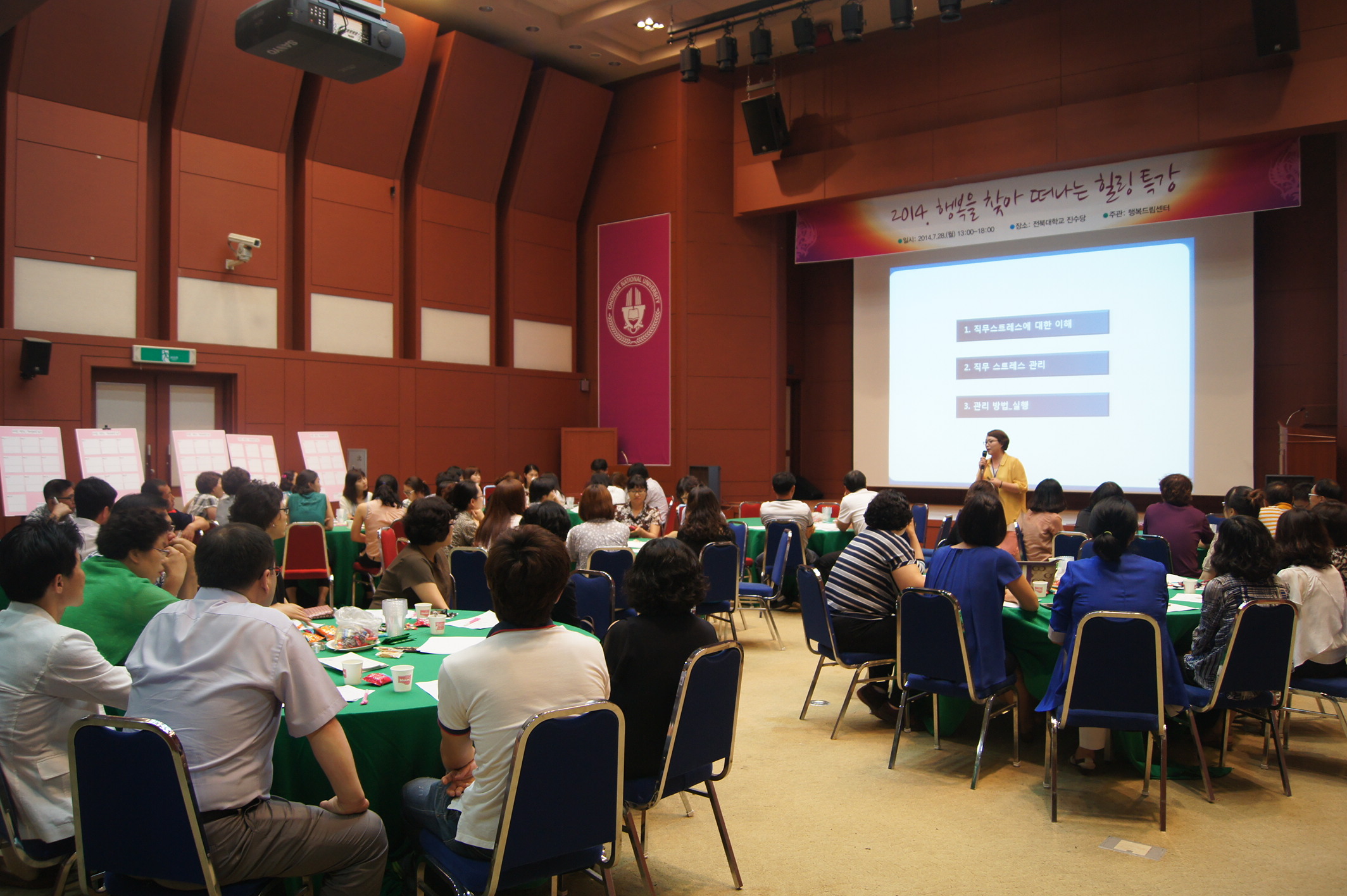 최근 직장인들의 직무스트레스 문제가 대두되면서 스트레스 관리에 대한 개인의 노력 외에도 기관차원의 노력이 요구되고 있다. 구성원이 건강해야 조직 내 업무의 효율성이 높아지고, 밝고 건강한 분위기를 만들 수 있다는 차원에서 우리대학 직장교육에서 교직원들의 정신건강을 위한 특강과 정신건강을 자가진단을 해보는 시간이 진행돼 많은 이들의 호응을 얻었다.