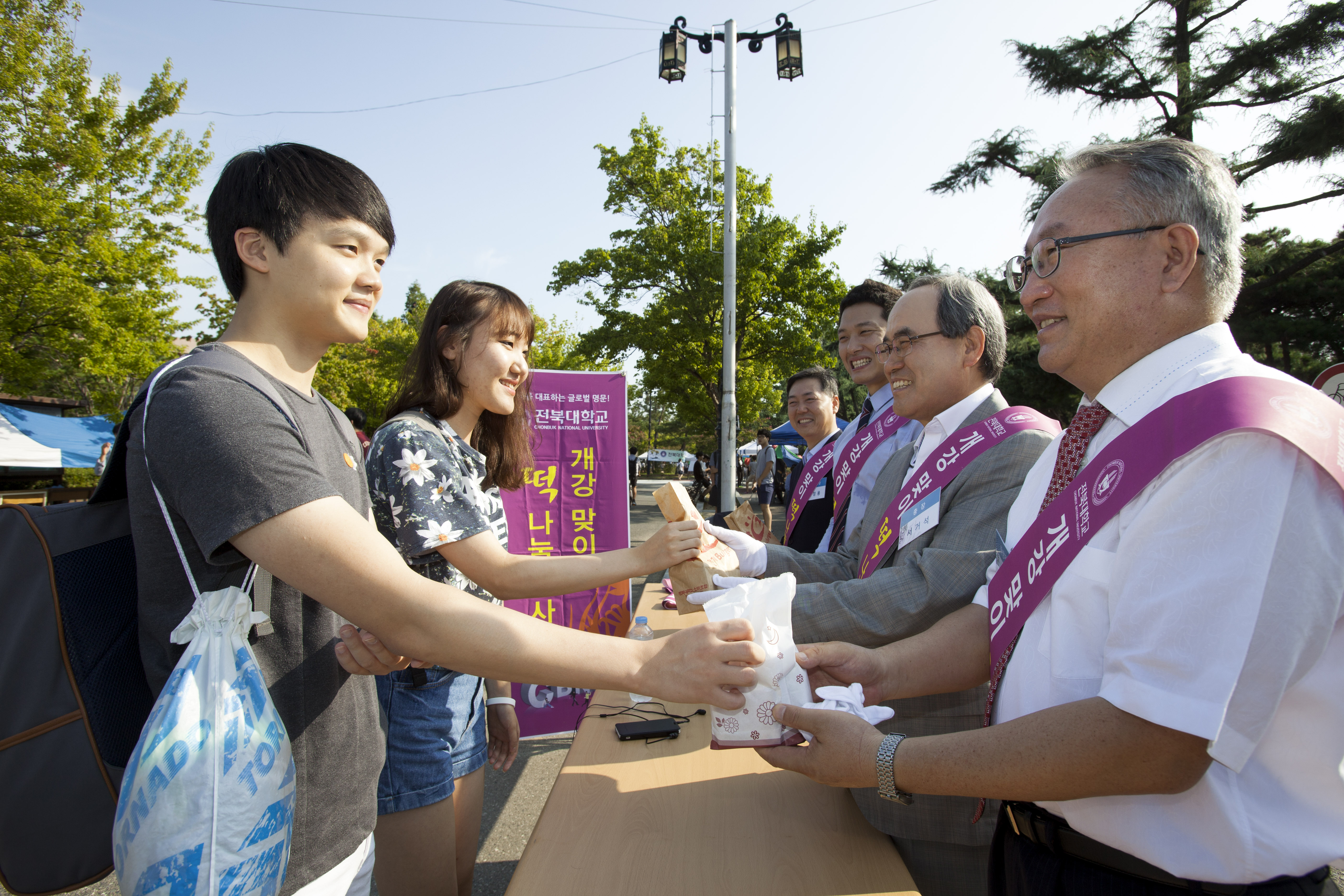 매년 새 학기 등교하는 학생들에게 간식을 나누며 인사를 건네는 깜짝 이벤트가 열렸기 때문이다. 서 총장을 비롯한 보직교수들은 전북대 정문 등 7개 출입문에 모여 등교하는 학생 한 명 한 명에게 떡과 음료를 나눠주며 새 학기 인사와 덕담을 건넸다.