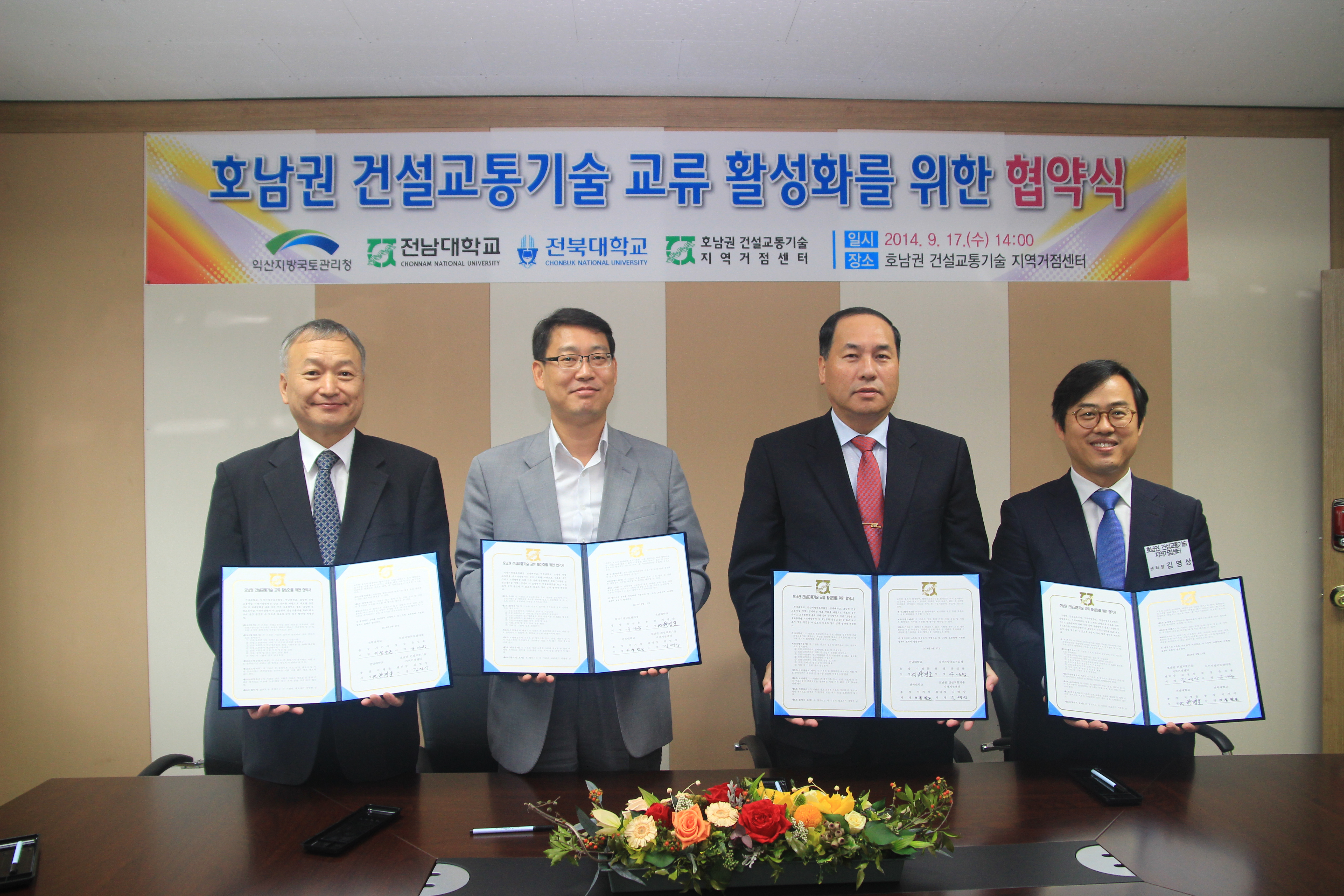 지난 9월 17일 오후 전남대 여수캠퍼스에서 우리대학 정항근 부총장과 유성용 익산지방국토관리청장, 한경호 전남대 부총장, 김영상 호남권 건설교통기술 지역거점센터장 등이 참석한 가운데 상호교류 및 협력을 위한 양해각서(MOU)를 체결했다.