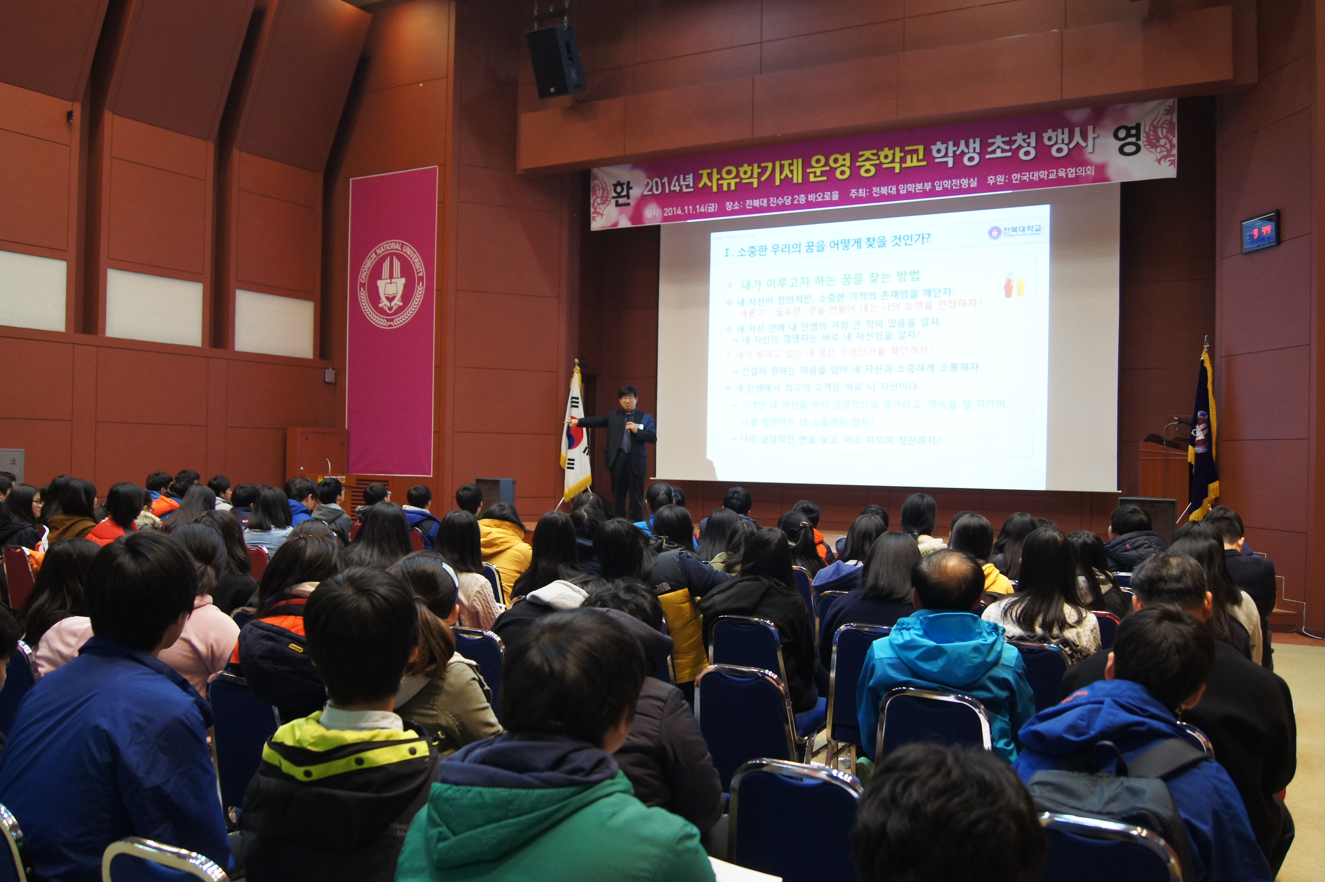 입학전형실은 공교육 정상화 정책에 부응하기 위해 11월 14일 하루 동안 자유학기제를 실시하는 전북지역 31개 중학교 학생들을 대학에 초청해 진로진학 특강과 대학 소개 등을 실시했다.