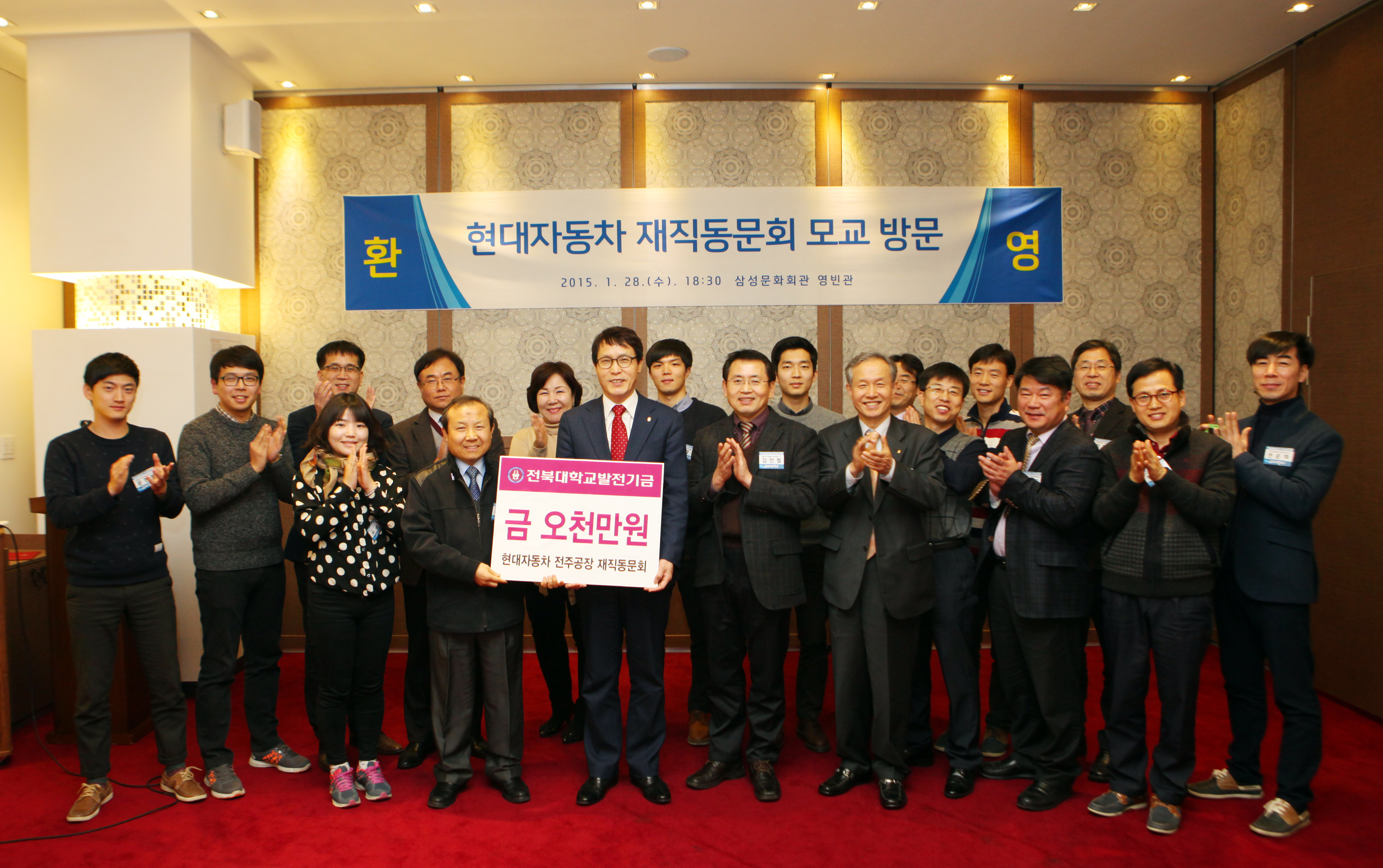 현대자동차 전주공장 재직동문회(회장 송윤엽·기계설계 79학번)가 모교 발전을 기원하며 5천만 원의 발전기금을 기탁했다.