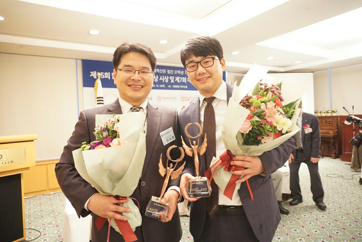 10월 15일 서울 장충동 서울클럽에서 개최된 시상식에서 송영석 직원은 한국대학교육협의회 회장상을, 이낙범 직원은 한국대학신문 회장상을 각각 받았다.