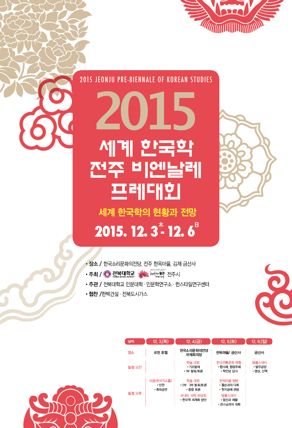 우리대학과 전주시가 공동 주최하고, 전북대 인문대학과 인문학연구소, 한스타일연구센터가 주관하는 세계 한국학 전주 비엔날레는 오는 12월 3일부터 6일까지 ‘세계 한국학의 현황과 전망’이라는 주제로 전주 한옥마을과 소리문화의 전당, 김제 금산사 등지에서 개최될 예정이다.
