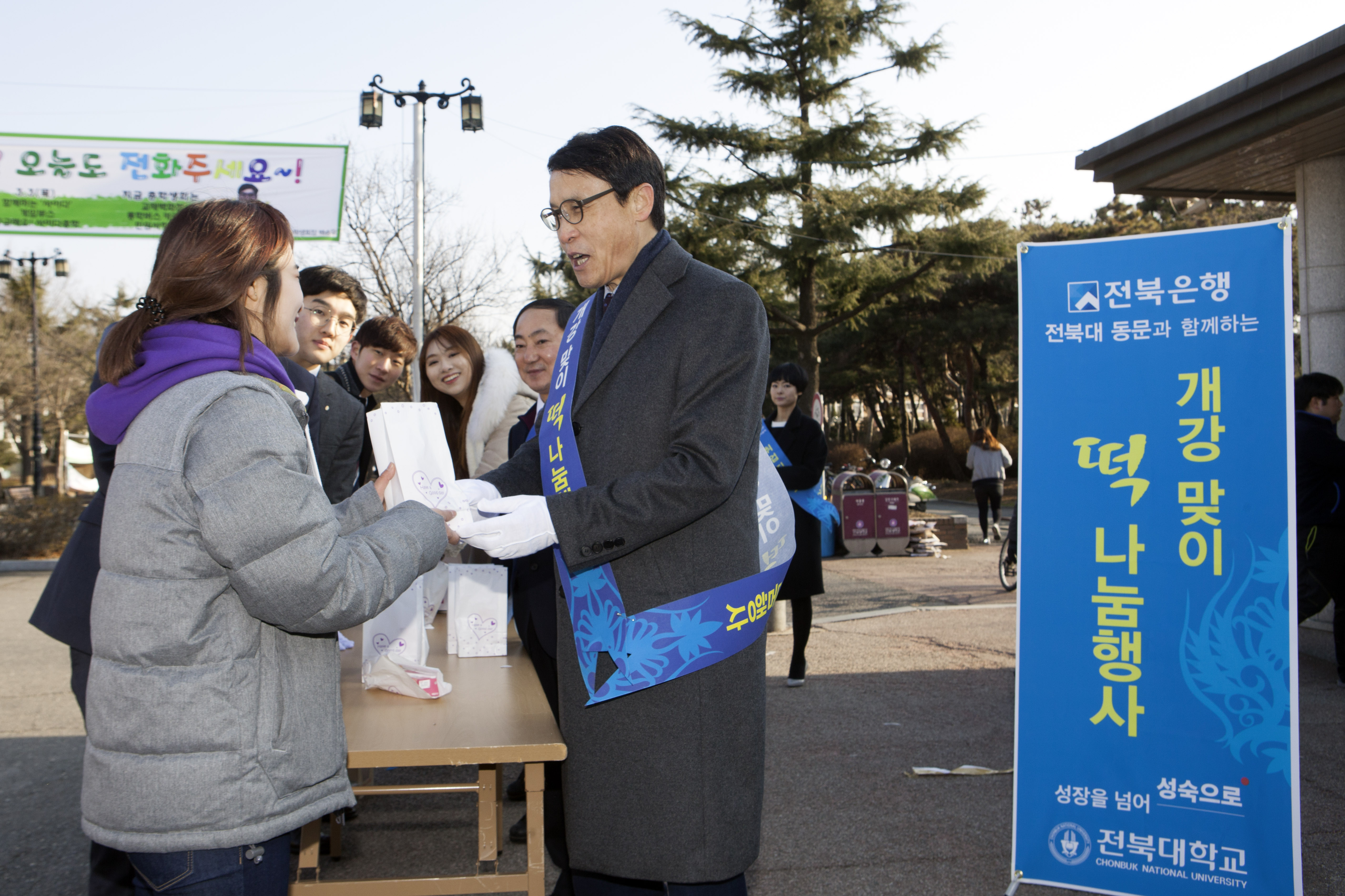 2016학년도 새 학기를 맞은 3월 2일, 전북은행 재직 전북대 동문회와 이남호 총장을 비롯한 대학 보직 교수들이 등굣길에 오르는 학생들에게 떡과 음료를 나누며 환영하는 시간을 가져 큰 호응을 얻었다.