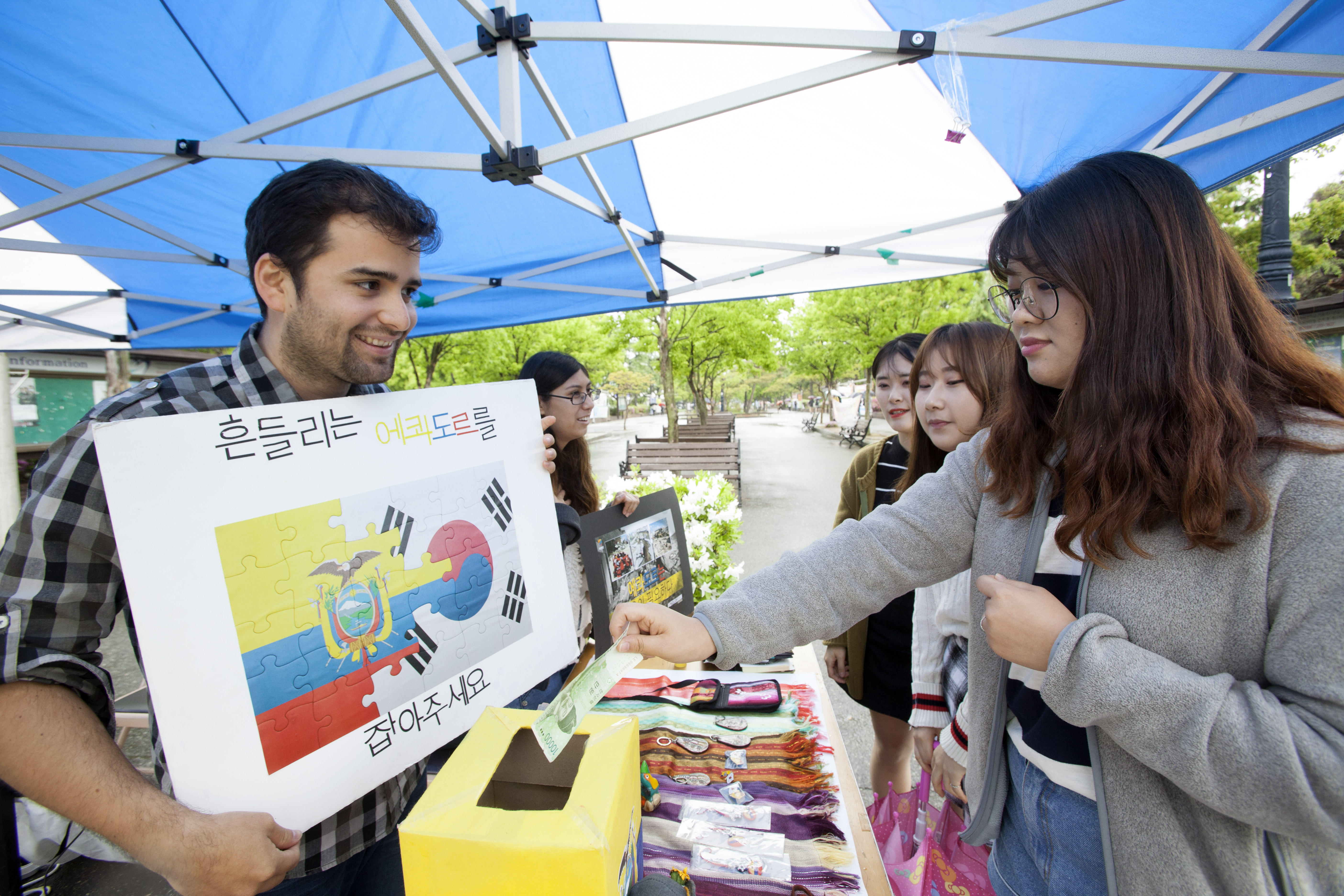 유학생지원센터와 대학에 재학 중인 에콰도르 유학생들은 지난 4월 25일부터 대학 구정문 일원에서 ‘에콰도르 지진 이재민 돕기’ 성금 모금 행사를 열고 있다. 모금은 29일(금)까지 계속됐다.
