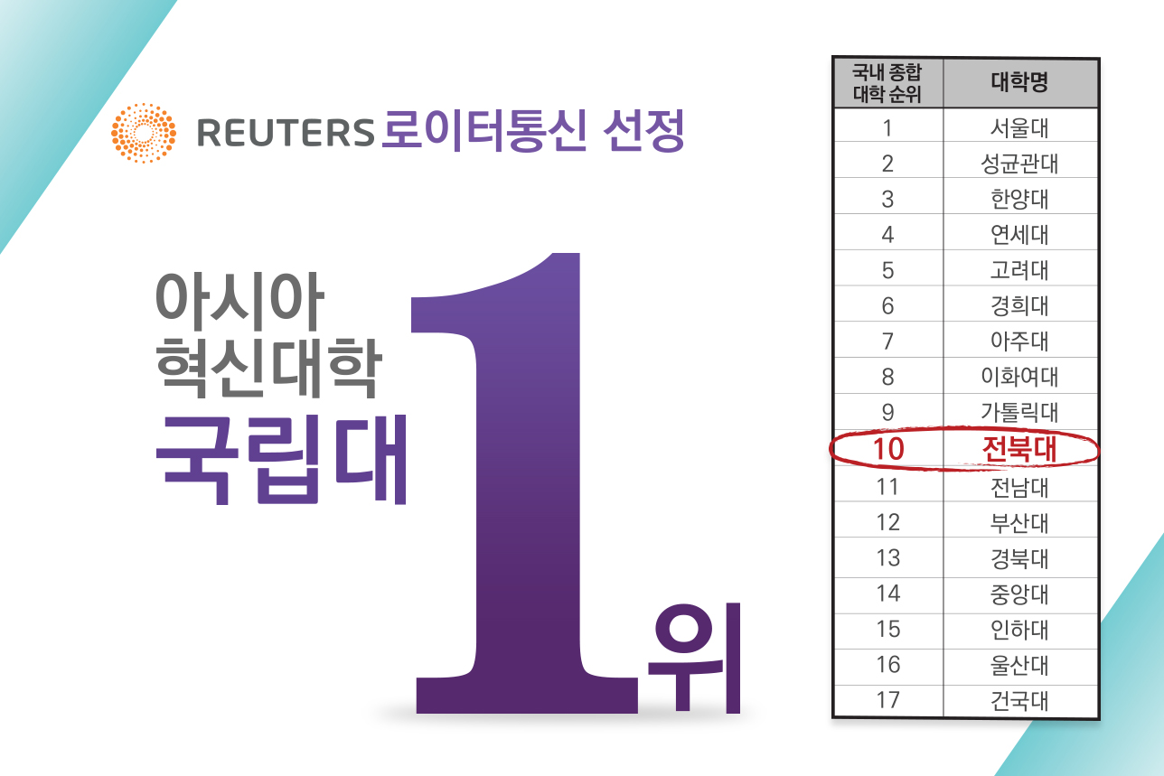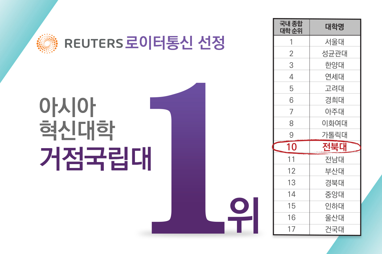우리대학이 로이터가 선정한 2018년 아시아 최고 혁신대학 평가에서 거점 국립대 1위에 올랐다.
