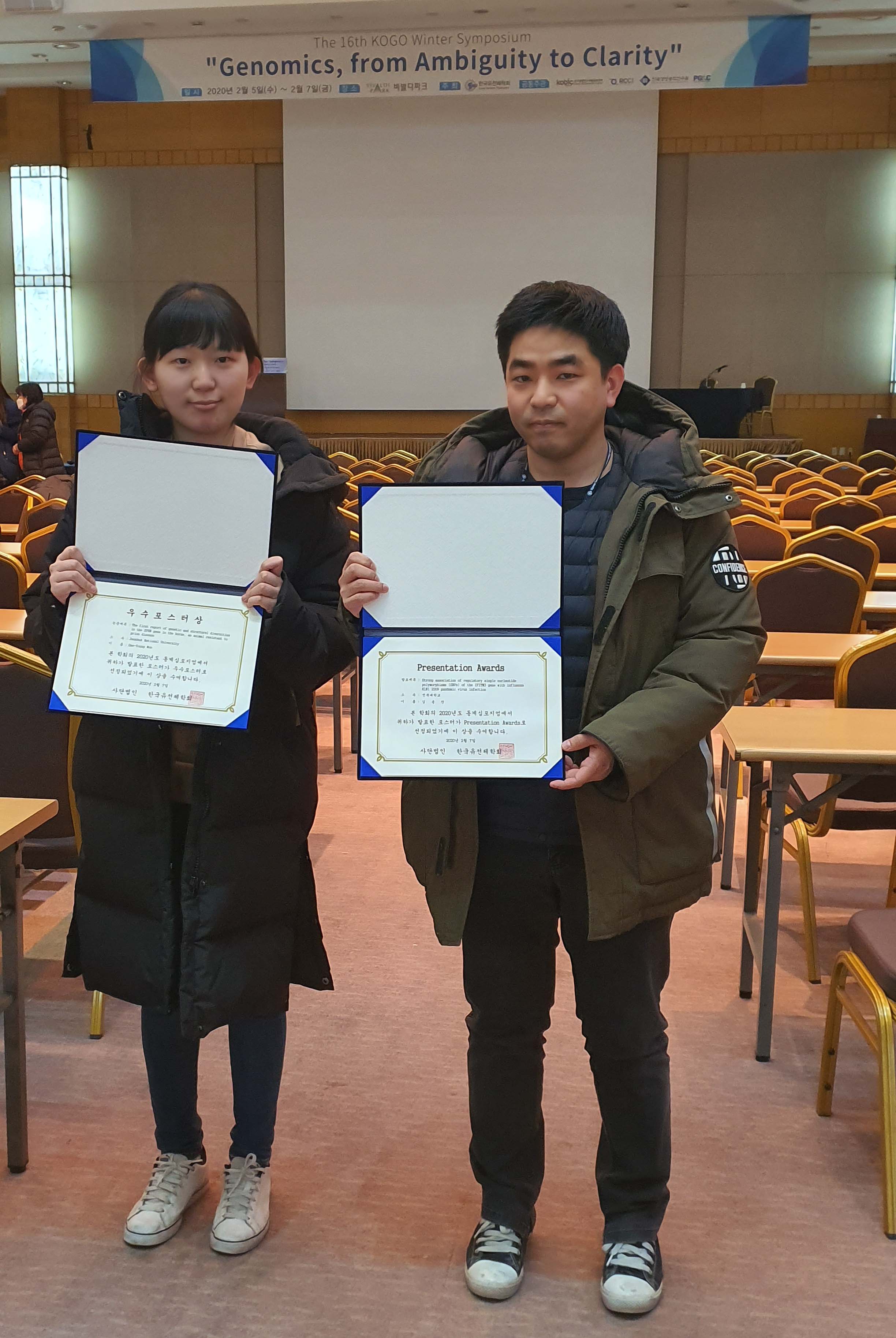 우리대학교 생리활성소재과학과 김용찬, 원세영 대학원생(지도교수 정병훈, 인수공통전염병연구소)이 지난 2월 5일에서 7일까지 강원도 홍천에서 열린 한국유전체학회 동계 심포지엄(The 16th KOGO Winter Symposium)에서 ‘젊은 과학자 발표상’ 및 우수 포스터상을 각각 수상했다.